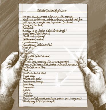 Her eyes grew wide and I continued, “This is just to give me inspiration for our explorations, and to know what your limits are.”